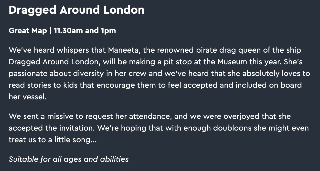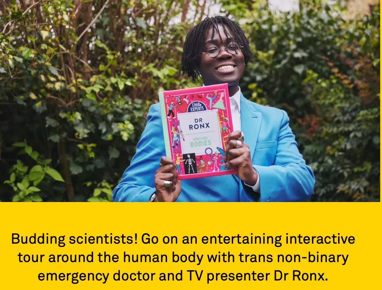 In due course I intend to highlight some of the other events marketed at children - for instance, ones on climate change - to demonstrate other types of ideological capture. But in the mean time, here’s a selection of “LGBTQ+ events” for half-term next week: