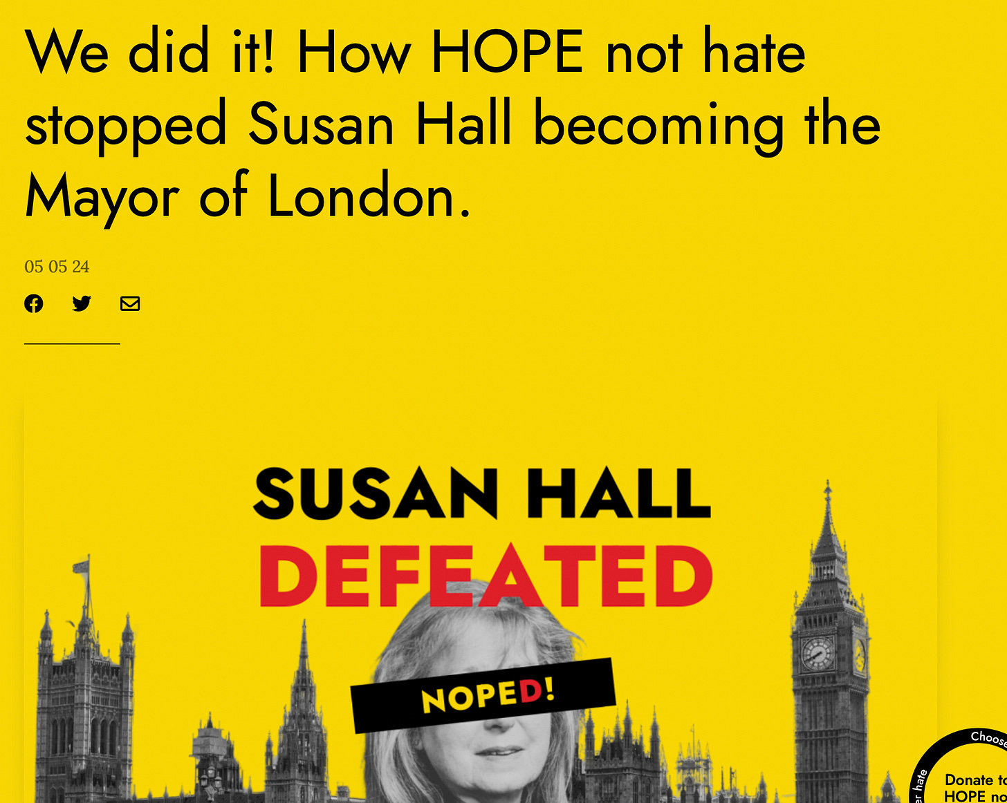 Congratulations to HOPE not hate, which claims it “stopped Susan Hall becoming the Mayor of London.”