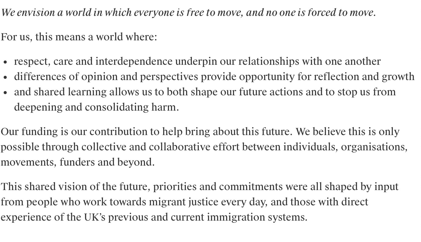 For instance, it has a “Migration Fund”, which envisions “a world in which everyone is free to move”: