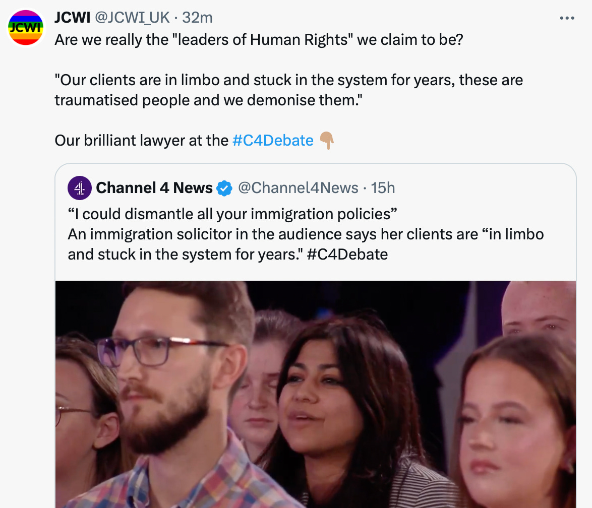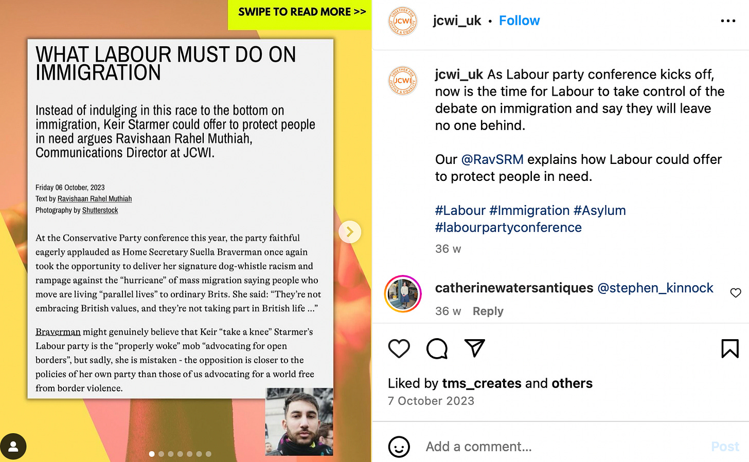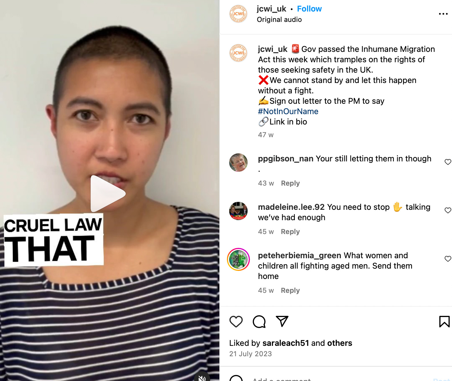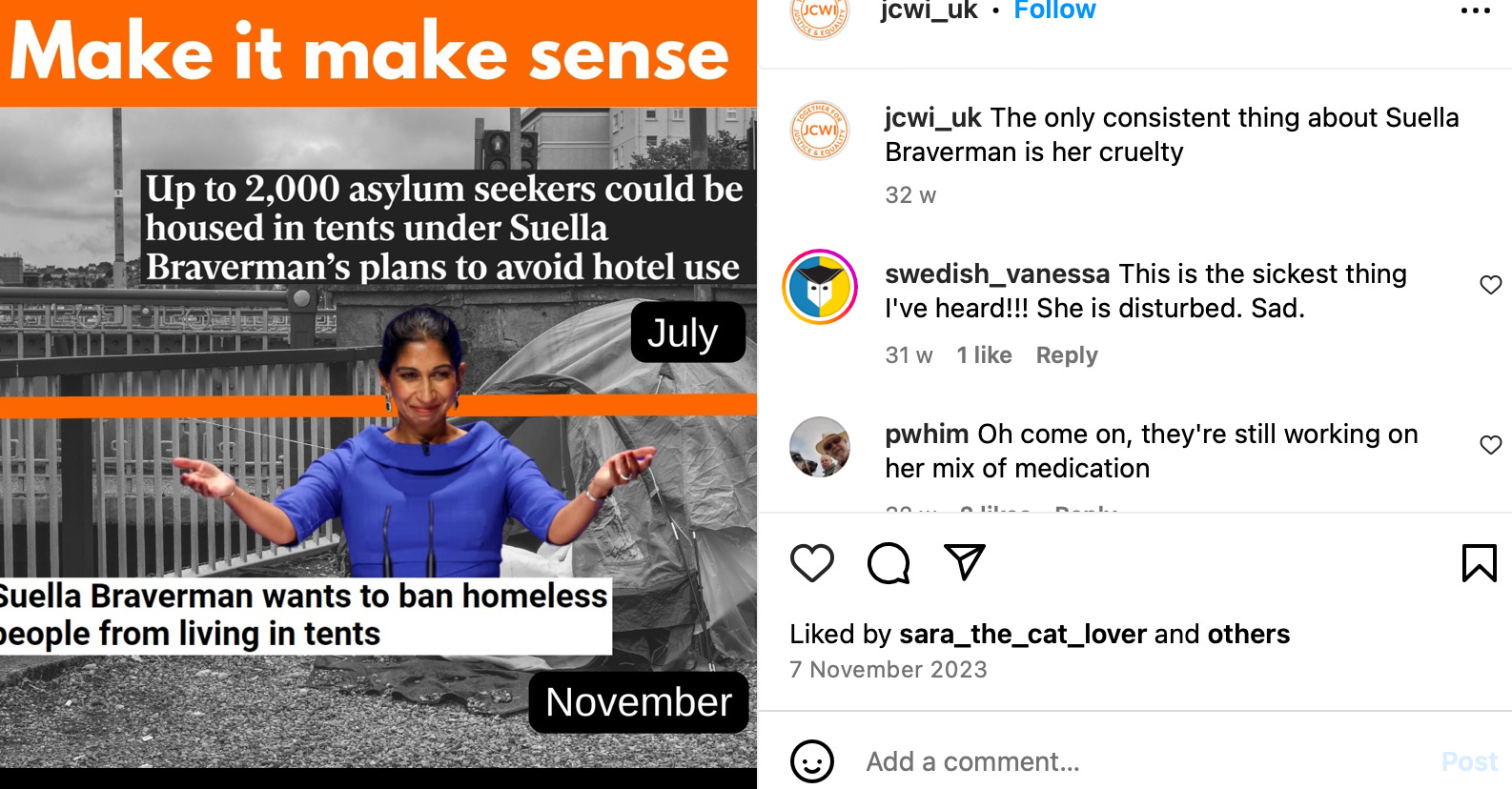 JCWI frequently makes its feelings known about government policy, helping to block flights to Rwanda and organising petitions. Here are images from its Instagram account: