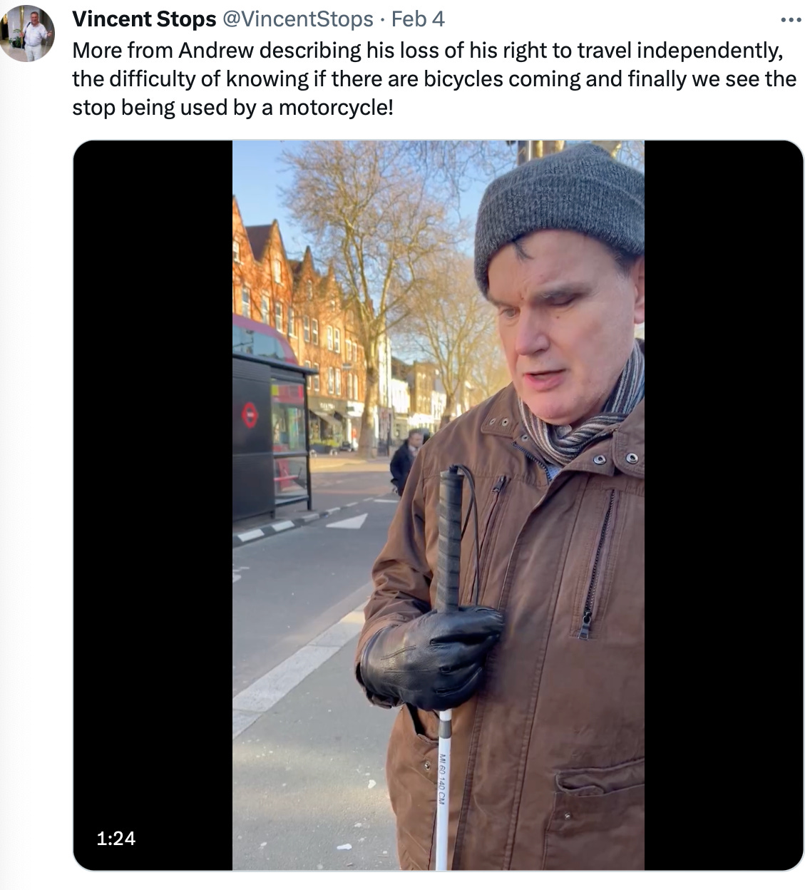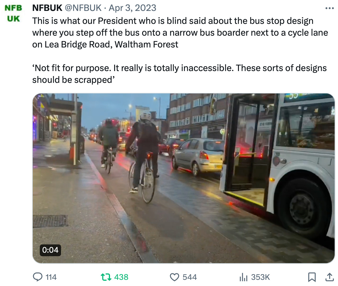Despite NFBUK’s valiant efforts, which include blind people demonstrating and articulating (see below) why they are struggling with the new infrastructure, Khan’s administration has pretty much blanked them - and, indeed, carried on with installations that limit vulnerable groups’ independence.
