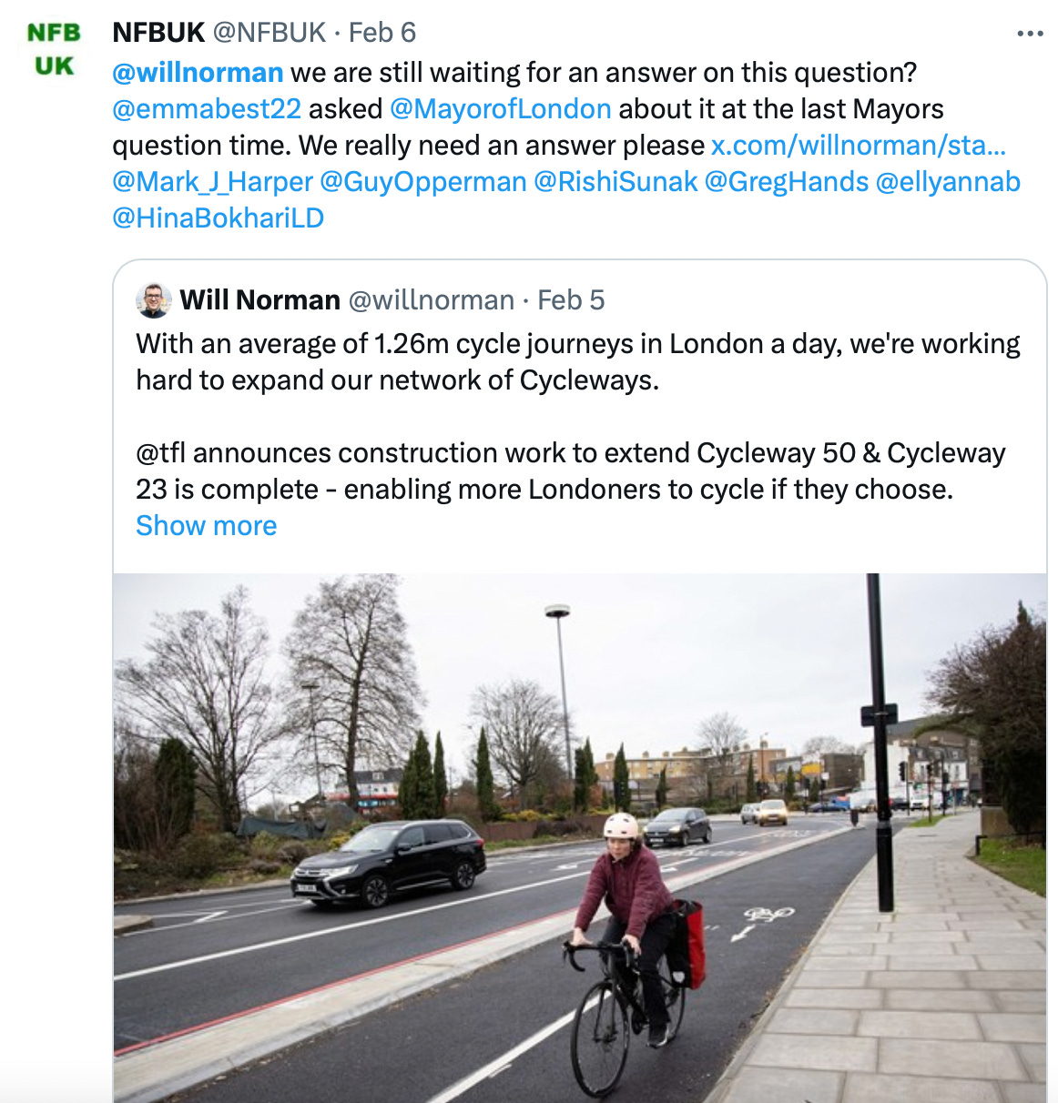 Here is an example of NFBUK trying to engage Norman, and getting nowhere - even though Norman is the “Walking and Cycling Commissioner” - aka, he is also meant to be supporting people with the former too.