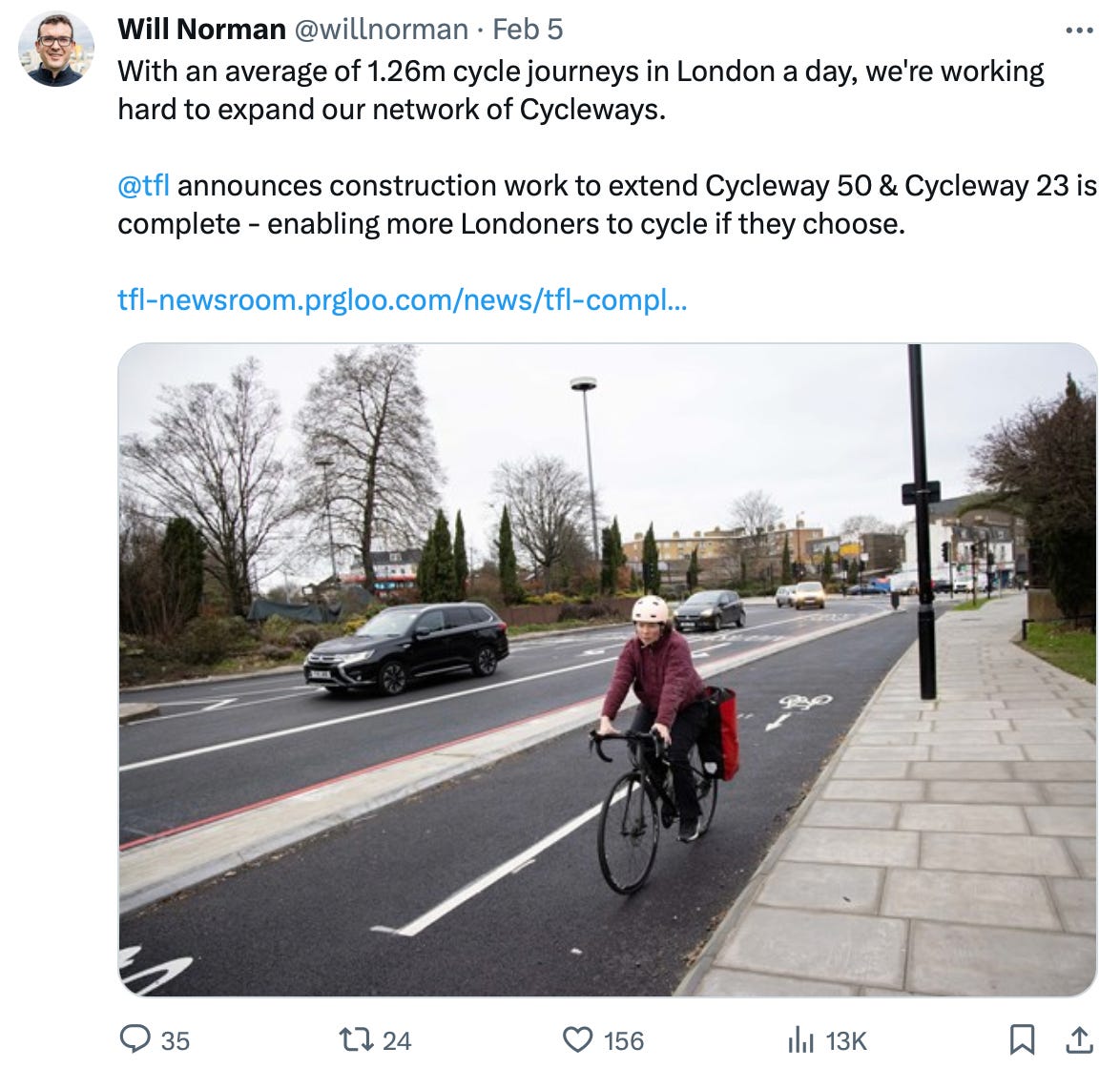 One Norman’s favourite bits of infrastructure is “low traffic cycleways”. TfL describes these as “Cycleways are high-quality cycle routes that link communities, businesses and destinations across London”.