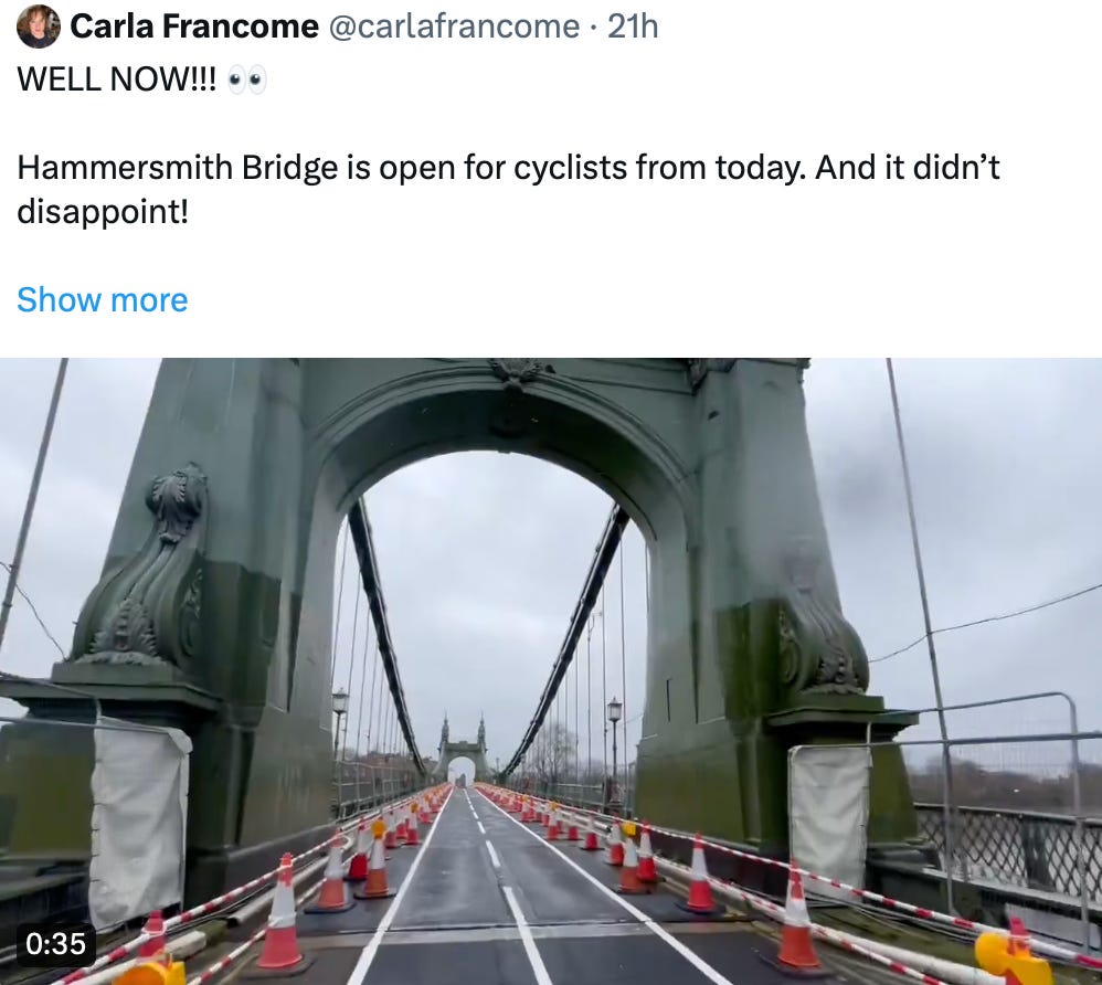 Hammersmith Bridge has been closed to all traffic for ages pending stabilisation and repair work, as you no doubt know.