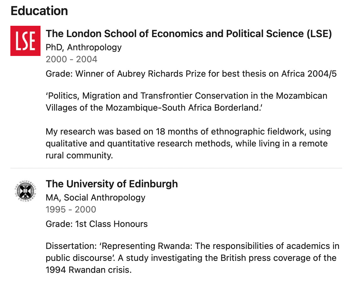 It turns out Norman is an expert in “Politics, Migration and Transfrontier Conservation in the Mozambican Villages of the Mozambique-South Africa Borderland’”, and before that the “responsibilities of academics in public discourse” when representing Rwanda.