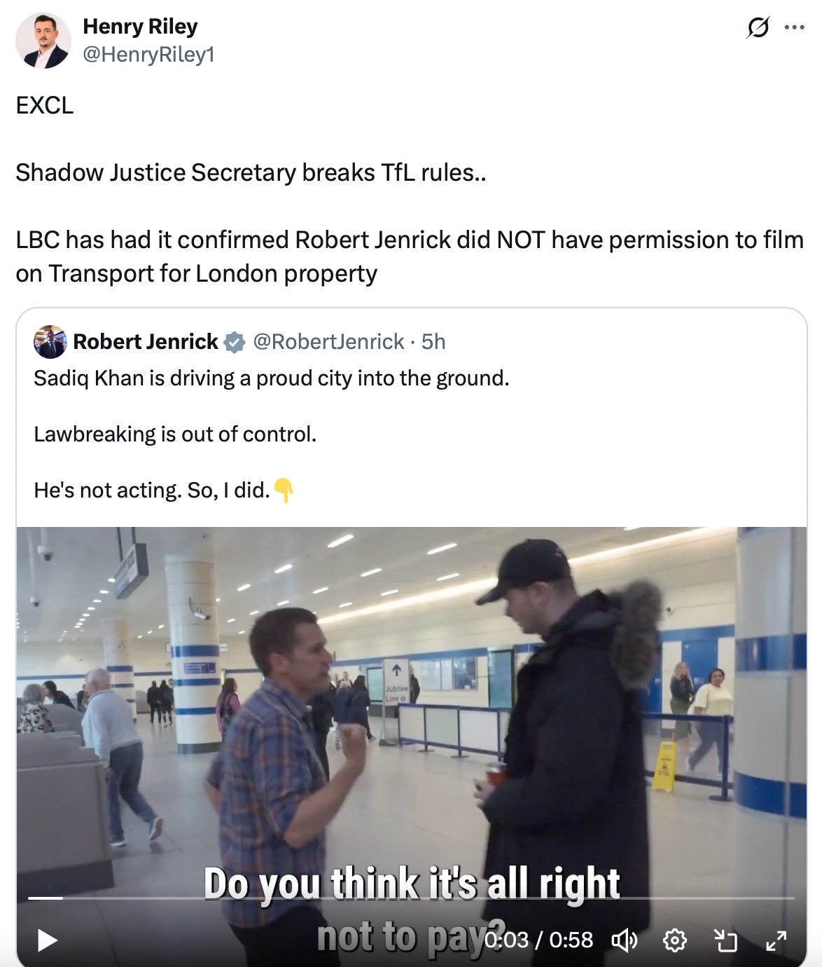 Soon afterwards, Henry Riley, a reporter and presenter from LBC, had an âexclusiveâ about Jenrickâs exclusive, claiming that the Shadow Justice Secretary broke Transport for London (TfL) rules. âLBC has had it confirmed Robert Jenrick did NOT have permission to film on Transport for London propertyâ, he posted on X: