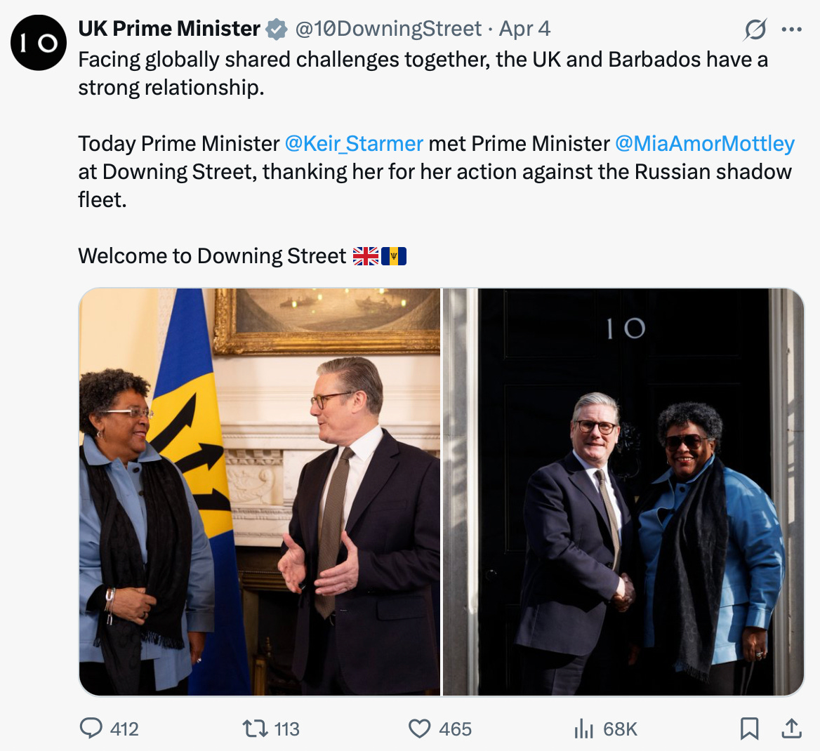 The UK Prime Minister (official) X account briefly mentioned the meeting, focussing on the “strong relationship” between the UK and Barbados, and how Mottley had taken “action against the Russian shadow fleet”. A short Government press release was along similar lines.