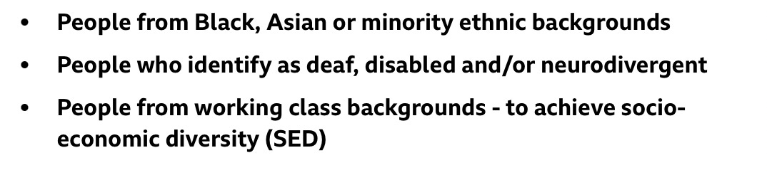 … which stipulates that “For all new commissions from 4 September 2024”, production companies have “to commit to at least 25% of their production teams being from the following underrepresented groups”: