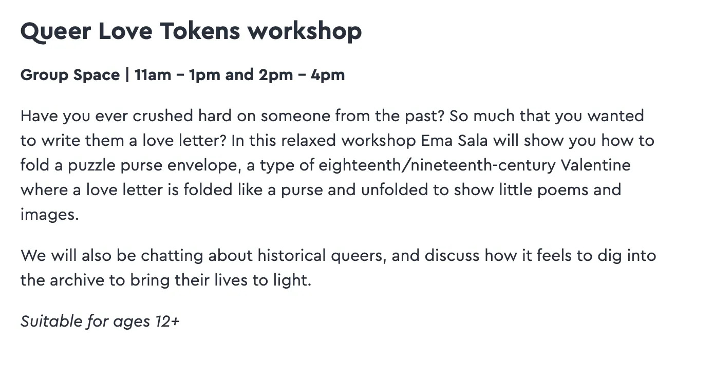 A Queer Love Tokens workshop including a chat âabout historical queersâ (for ages 12+):