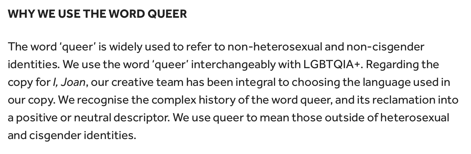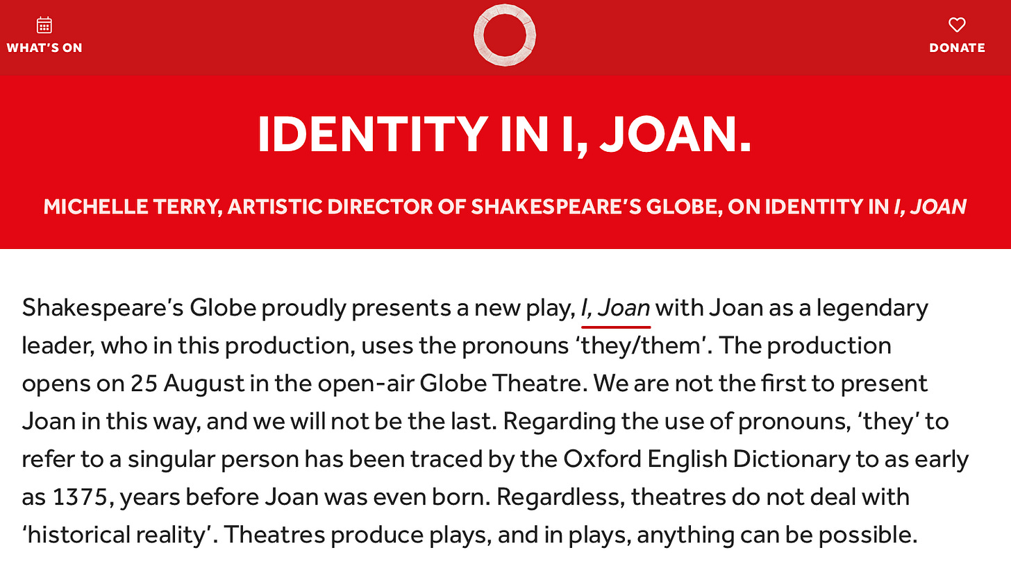 Woke Waste: Turned Joan of Arc into a ânon-binaryâ person in its production I, Joan; publishes a gender identity resource list; recommends Mermaids, Stonewall and Gendered Intelligence as charities/ places to get advice.