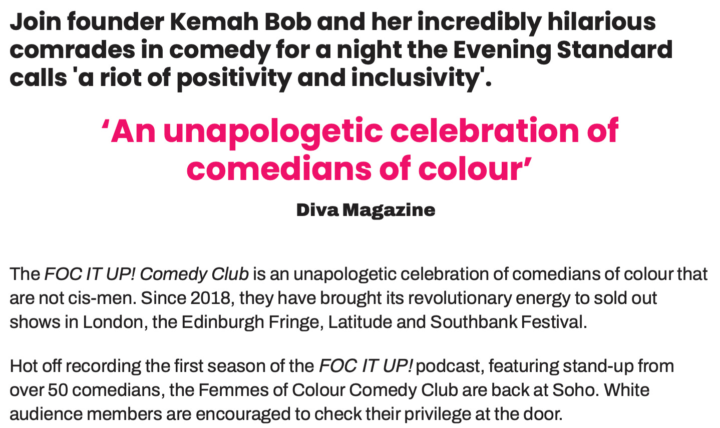 Has a comedy show that where âWhite audience members are encouraged to check their privilege at the doorâ: