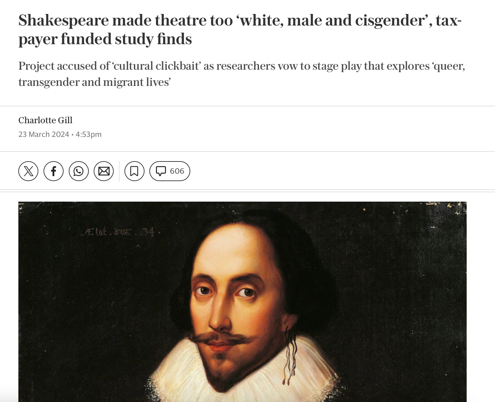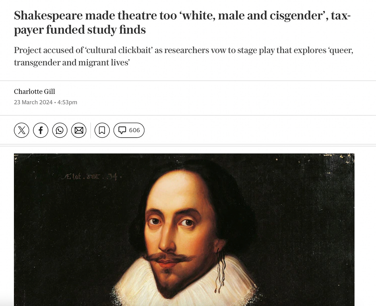 Woke Waste: Facilitating a project that says the âdisproportionate representationâ of William Shakespeare in the theatre has propagated âwhite, able-bodied, heterosexual, cisgender male narrativesâ. Piece here: