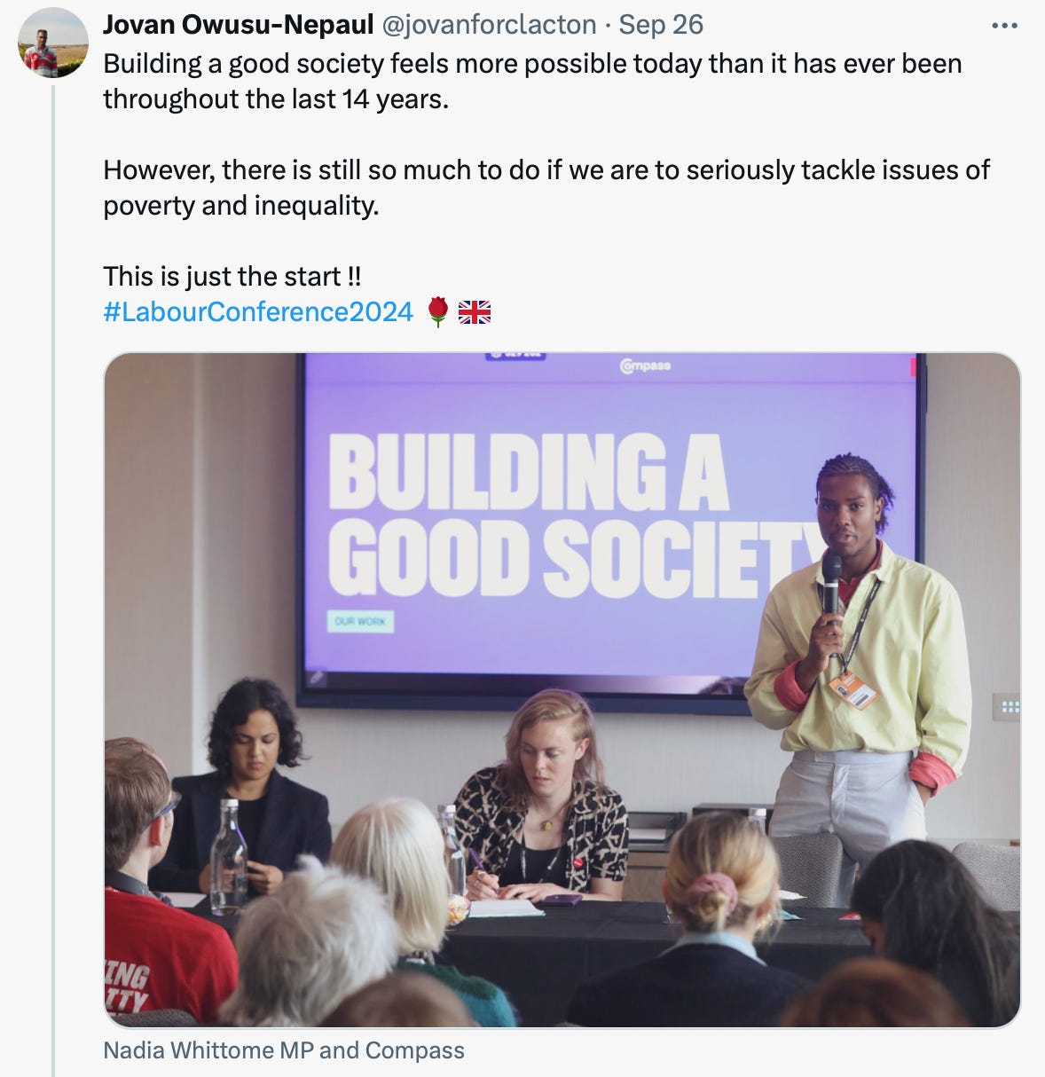 Compass held an event at the Labour Party conference where Whittome and Jovan Owusu-Nepaul, who stood against Nigel Farage in Clacton, spoke: