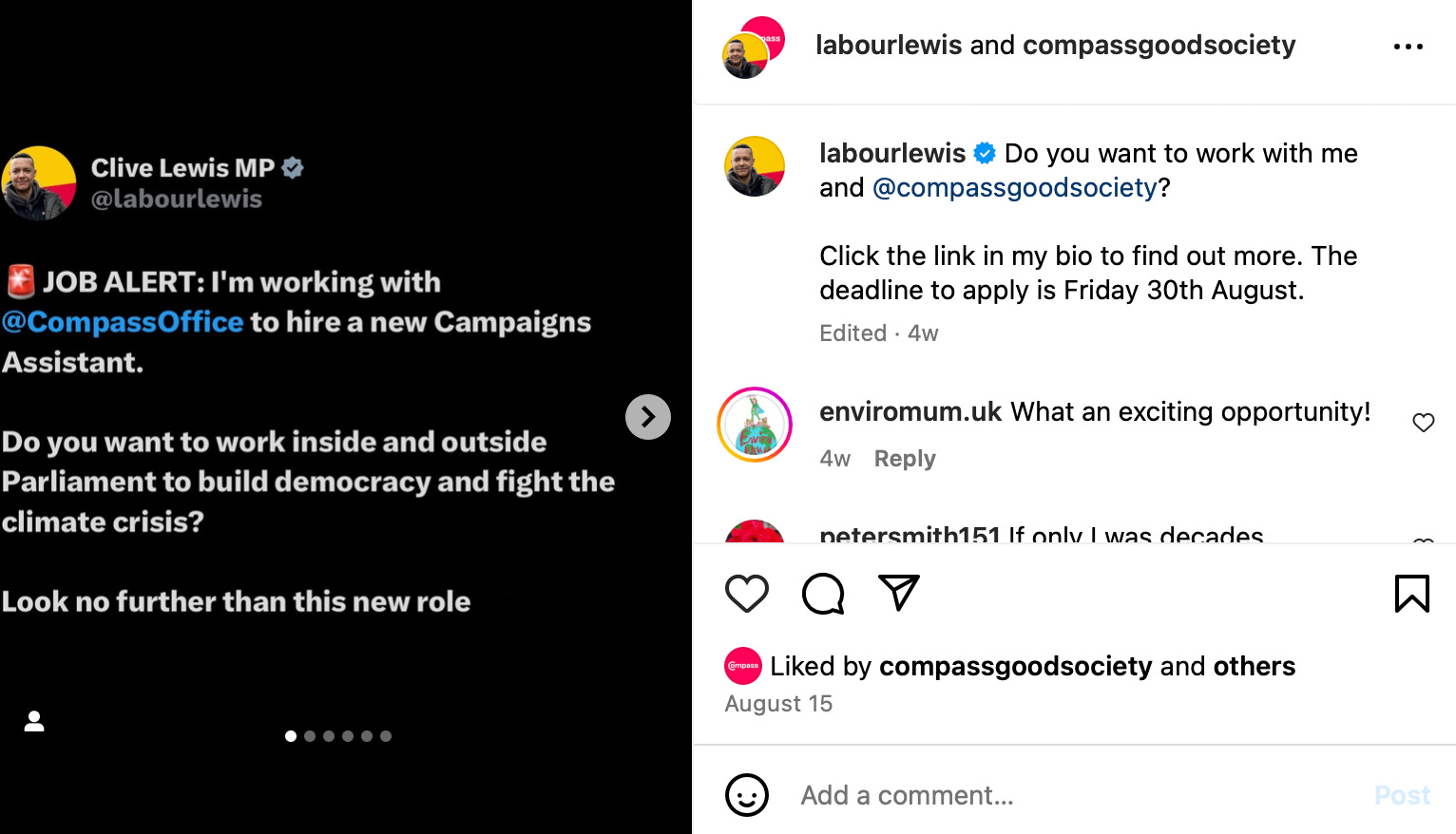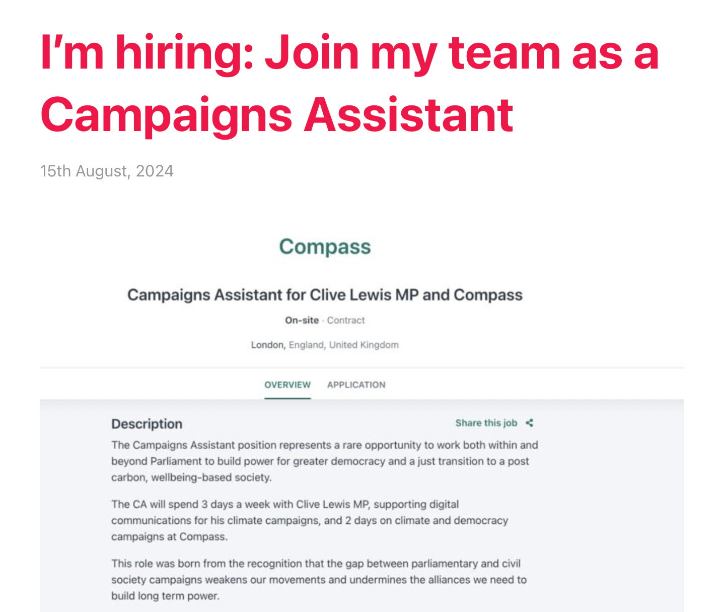 The CA will spend 3 days a week with Clive Lewis MP, supporting digital communications for his climate campaigns, and 2 days on climate and democracy campaigns at Compass.