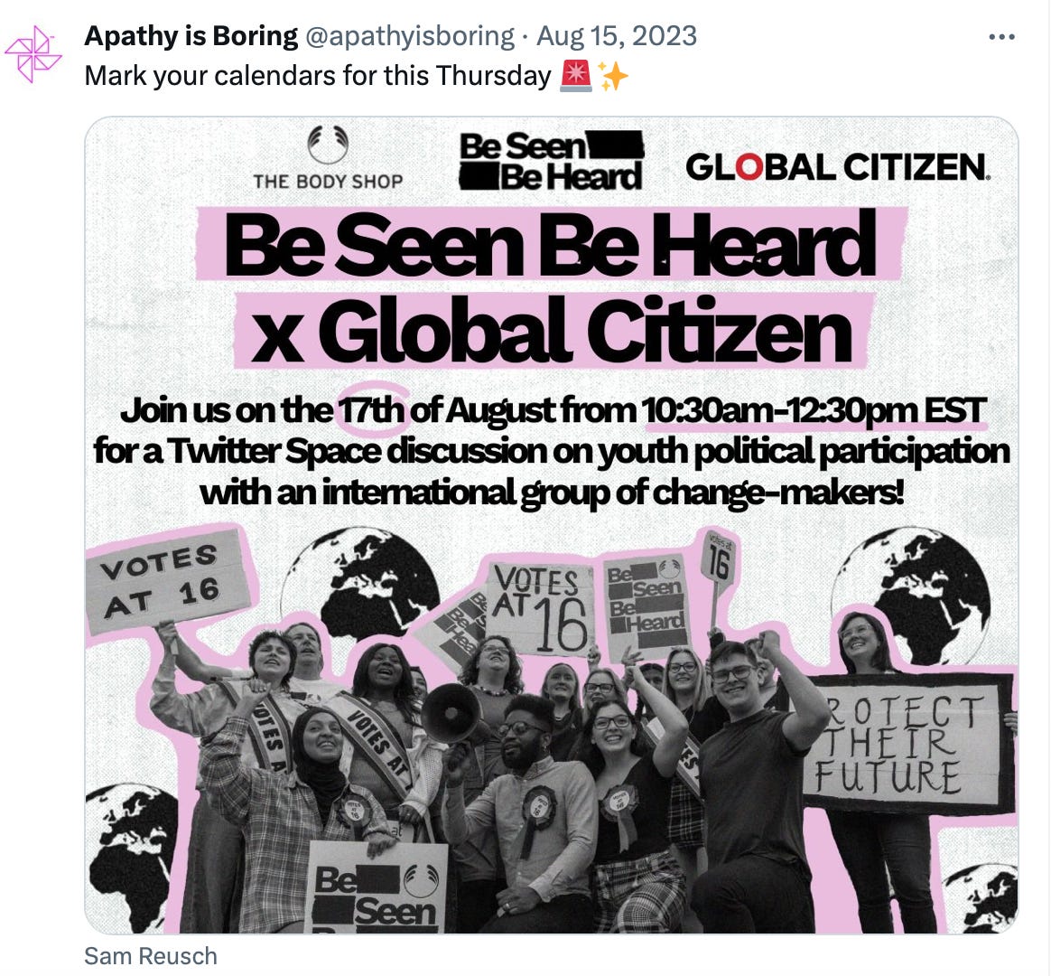 The charity has also partnered with ‘When We All Vote’, a US initiative, and ‘Apathy is Boring’ (a campaign directed at “Global Citizens” - backed by the Body Shop):